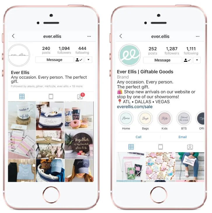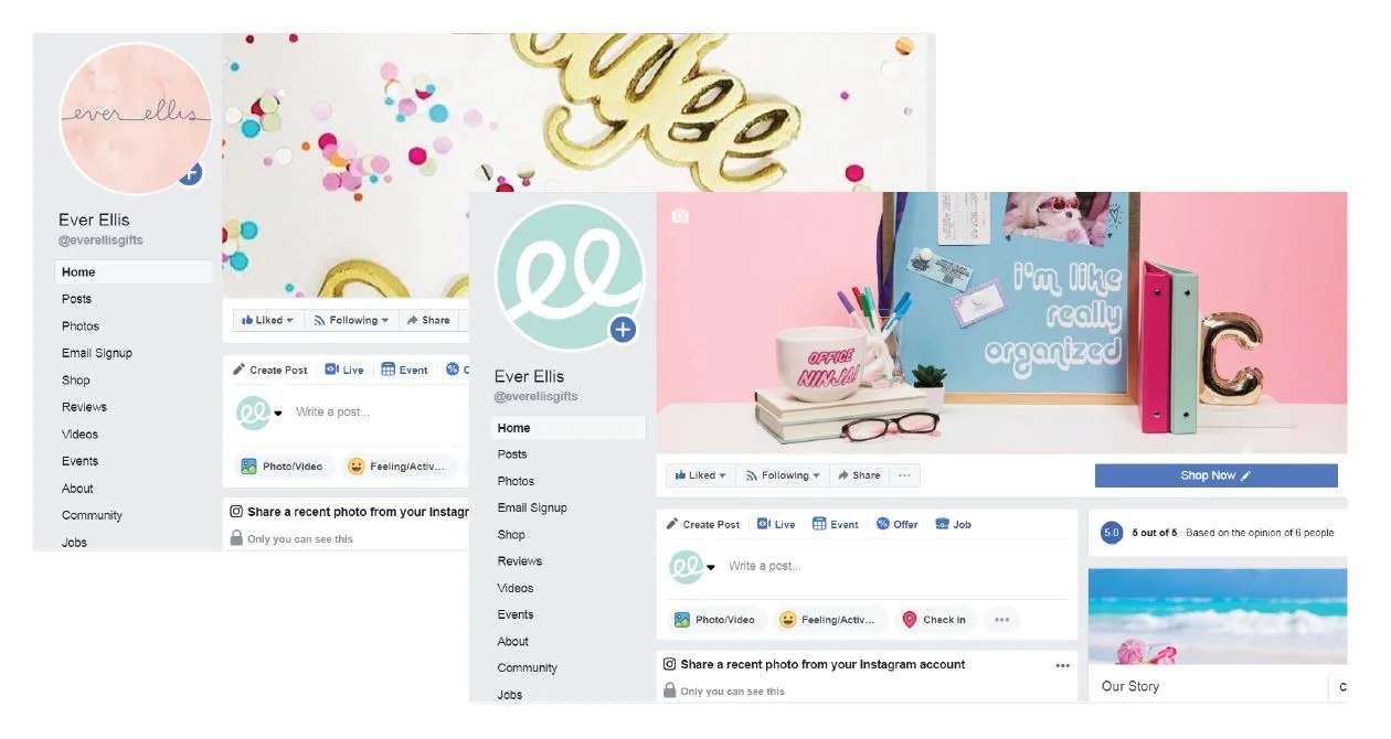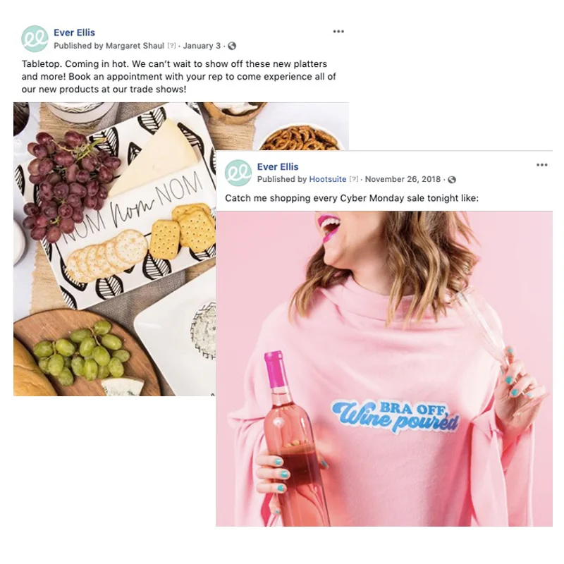 I rebranded Ever Ellis’s social profiles to reflect the fact that it is a wholesale brand that sells to stores. Beyond the tagline, I wanted to add a call to action to increase website clicks and also highlight showroom cities to add credibility and a frame of reference. I encouraged the team to use a new, abbreviated EE brand mark to add a splash of color and also because it’s more versatile than the full word mark. I utilized Facebook and Instagram stories to post time-sensitive updates that don’t necessarily need to be permanent posts or don’t fit into the brand’s visual aesthetic.